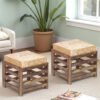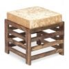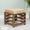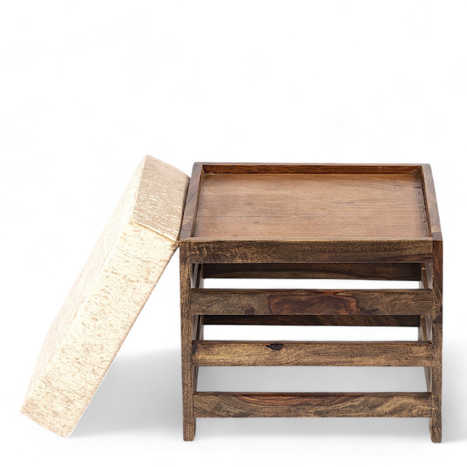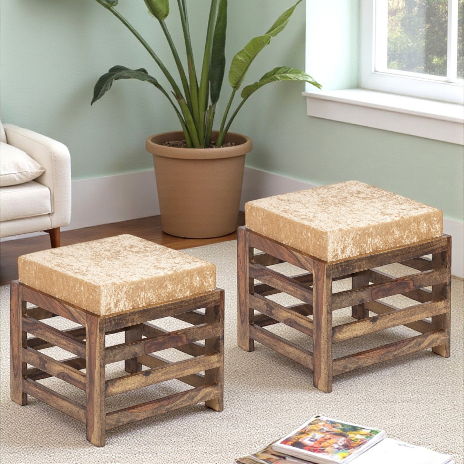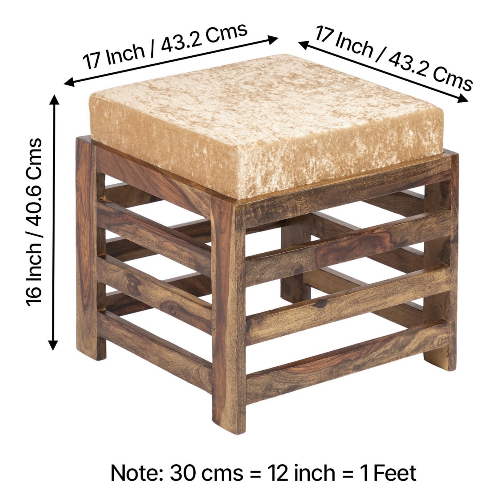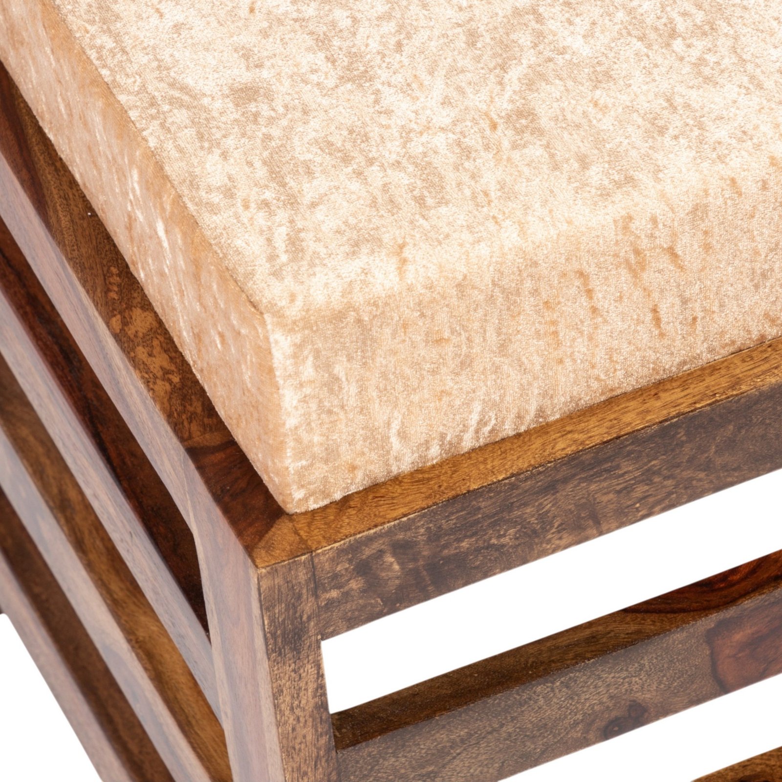 Ikiriya Houston Sheesham Wood Contemporary Square Stool in Teak Finish with Beige Sparkle Velvet Cushion