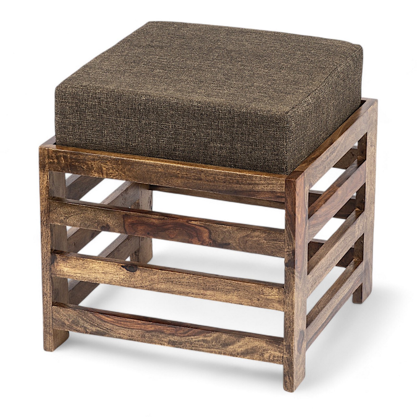 Ikiriya Houston Sheesham Wood Contemporary Square Stool in Teak Finish with Jute Brown Cushion
