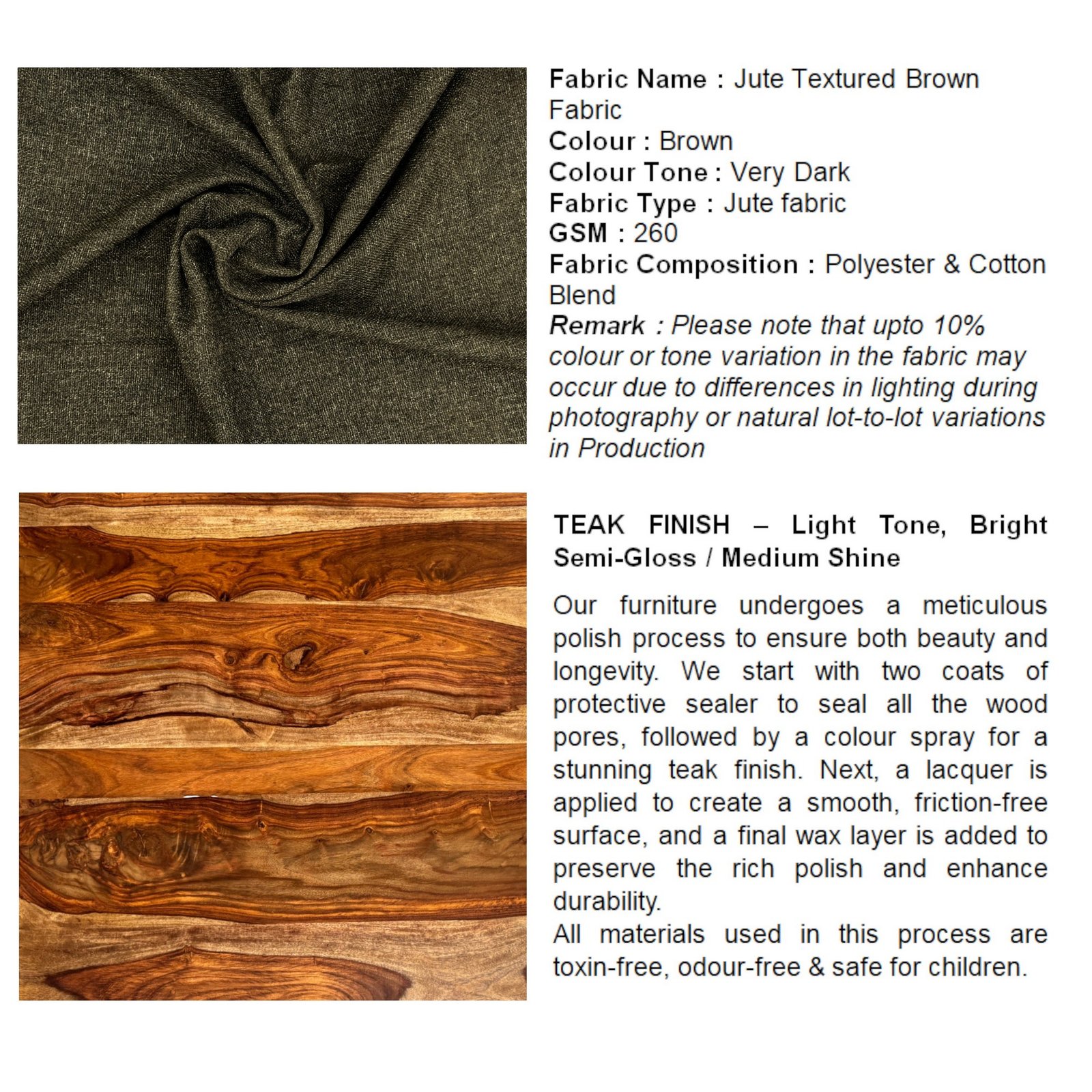 . Wood Finish: TEAK FINISH – Light Tone, Bright Semi-Gloss / Medium Shine