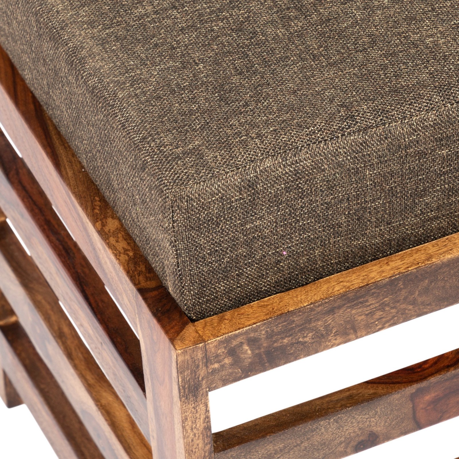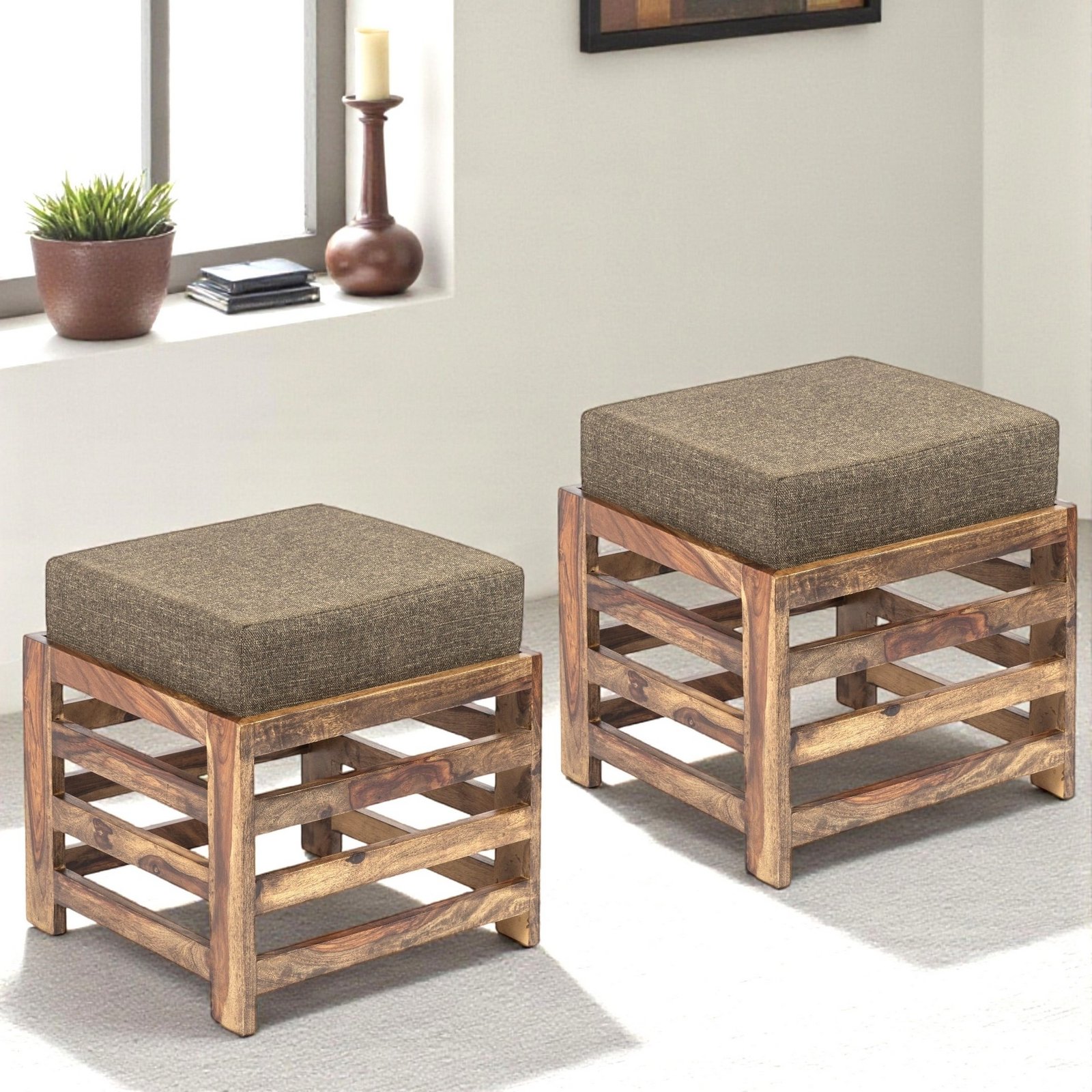 The Ikiriya ottoman embodies contemporary design with a luxurious fabric finish and a sturdy Sheesham wood frame. Whether used as a pouf, stool, or footrest, this piece is perfect for modern interiors. Ideal for homes, cafés, or commercial spaces, its sleek and functional design makes it a must-have for any stylish setting.