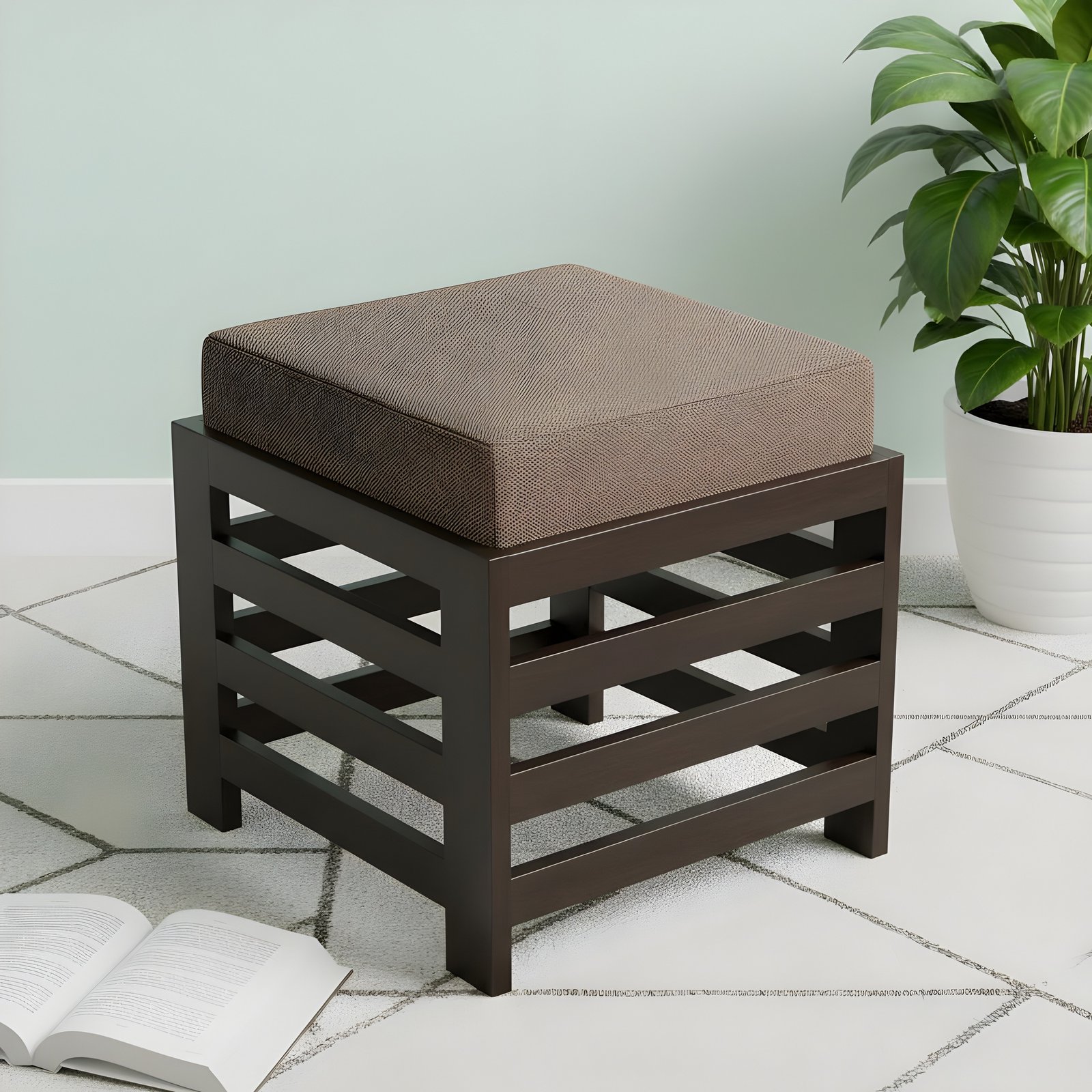 The Ikiriya ottoman embodies contemporary design with a luxurious fabric finish and a sturdy Sheesham wood frame. Whether used as a pouf, stool, or footrest, this piece is perfect for modern interiors. Ideal for homes, cafés, or commercial spaces, its sleek and functional design makes it a must-have for any stylish setting.