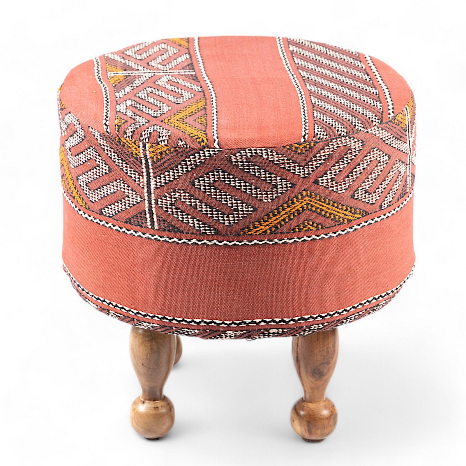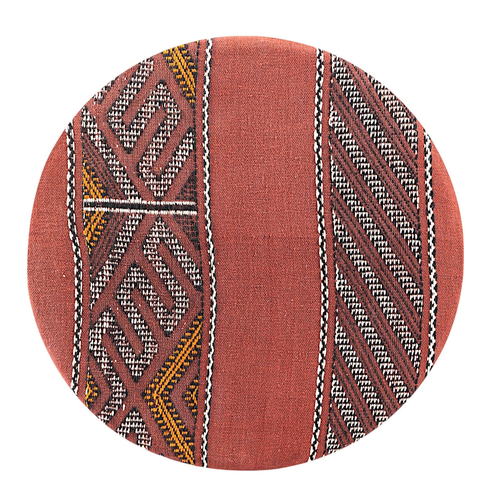 Ikiriya Louisville Acacia Wood Parisian Round Pouf Stool in Red Jacquard Work Fabric Upholstery