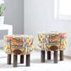 • Ikiriya Louisville Acacia Wood Parisian Round Set of 2 Pouf Stools in Multi-Colour Jacquard Work Fabric Upholstery