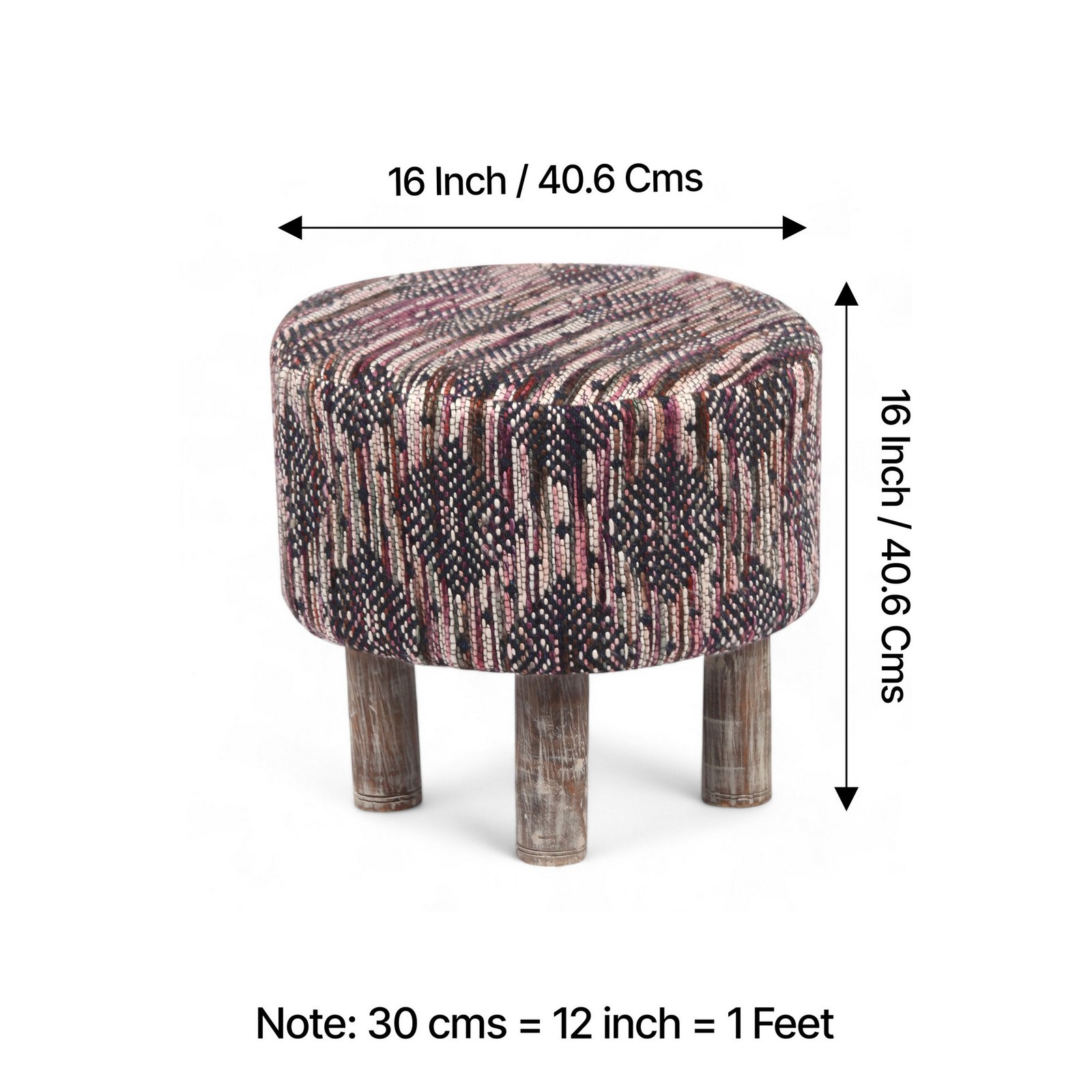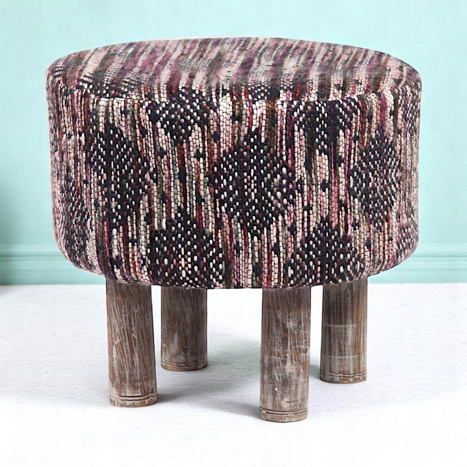 Ikiriya Morgan Acacia Wood Parisian Round Pouf Stool in Multi-Colour Jacquard Work Fabric Upholstery