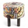 Ikiriya Morgan Acacia Wood Bohemian Round Pouf Stool in Israel Print Patchwork Kantha Upholstery