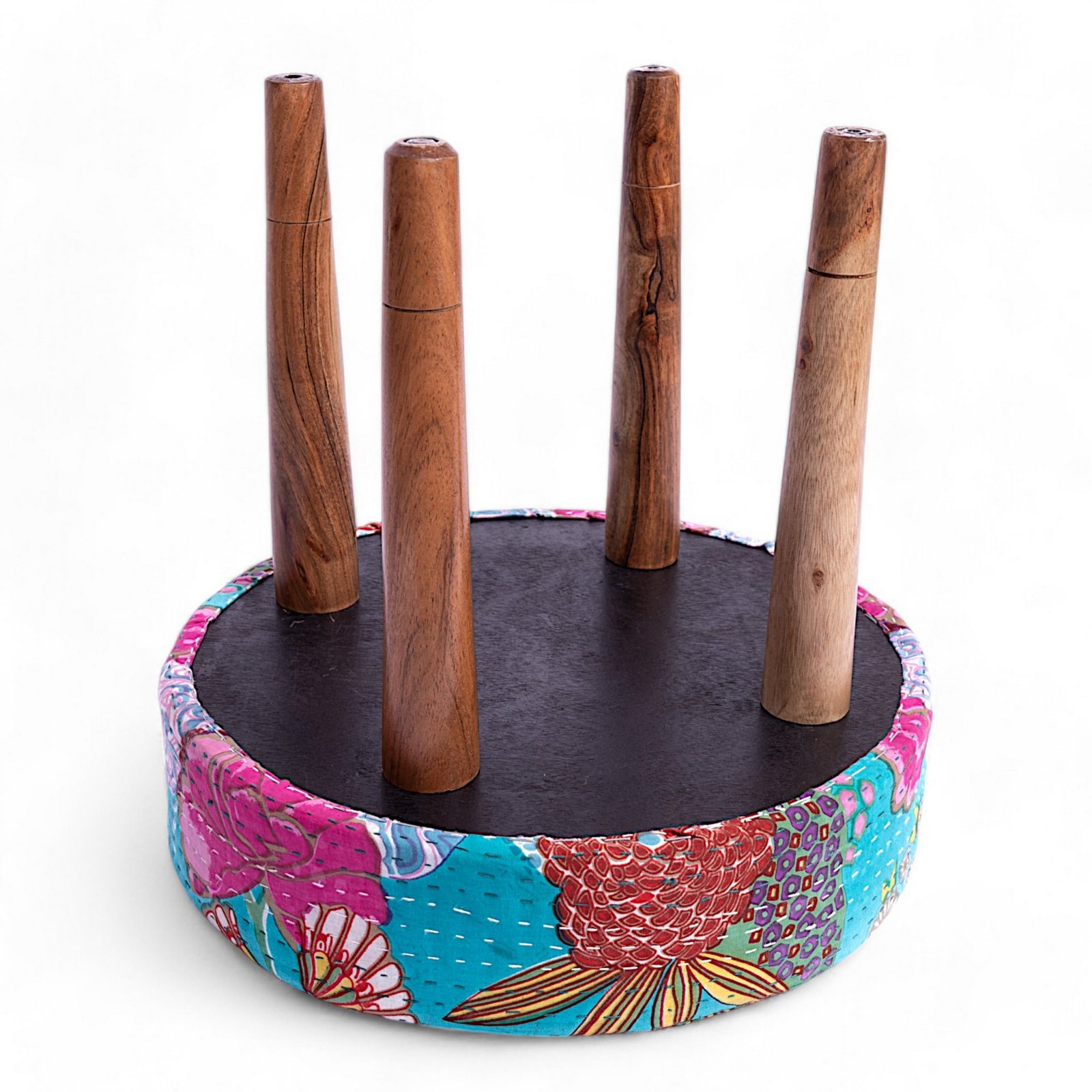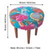 Ikiriya Nayla Sheesham Wood Mid Century Round Stool in Sea Green Fruit Print Kantha Upholstery