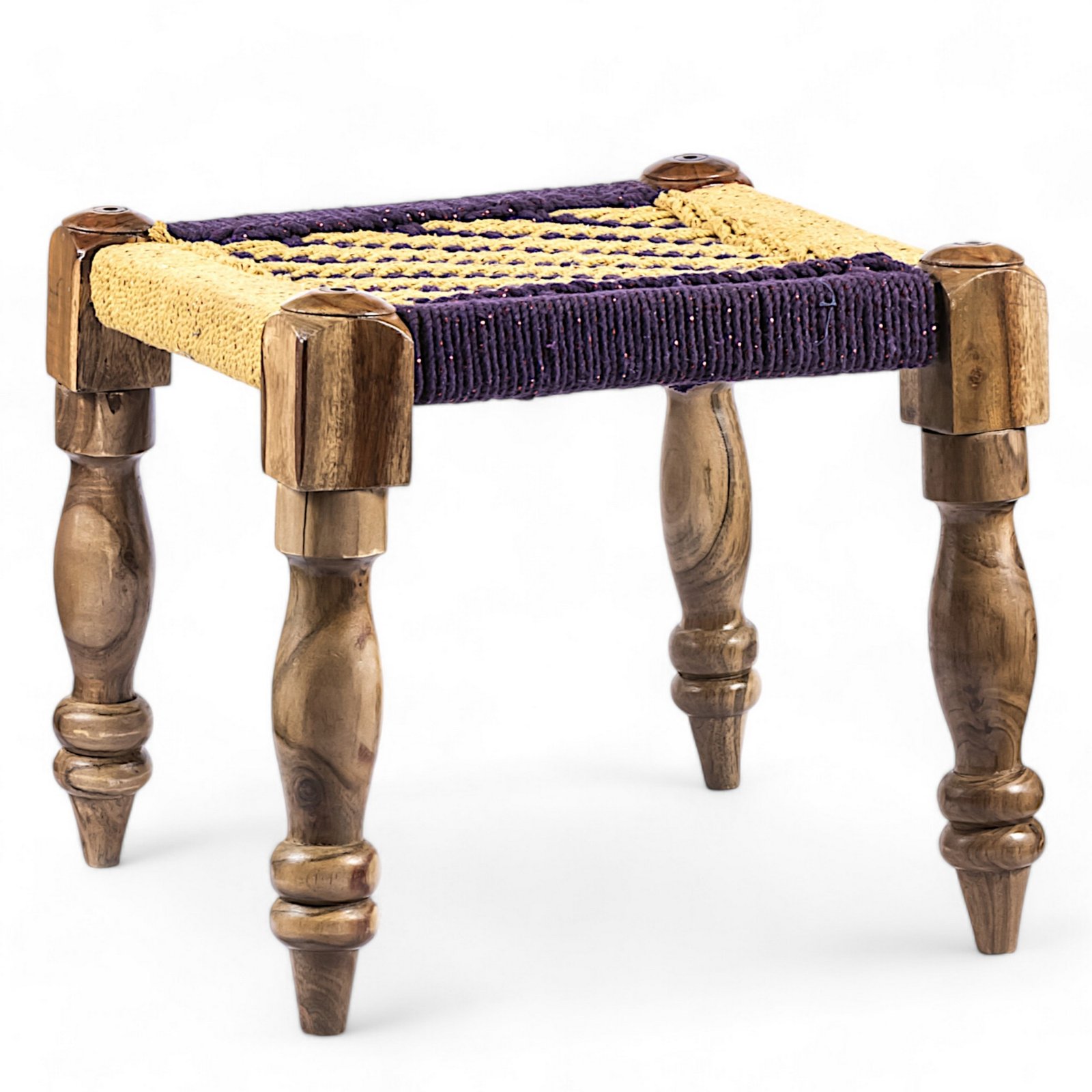 Ikiriya Riaza Sheesham Wood Vintage Square Maachi Set of 2 Stools in Yellow & Purple Rope Canning