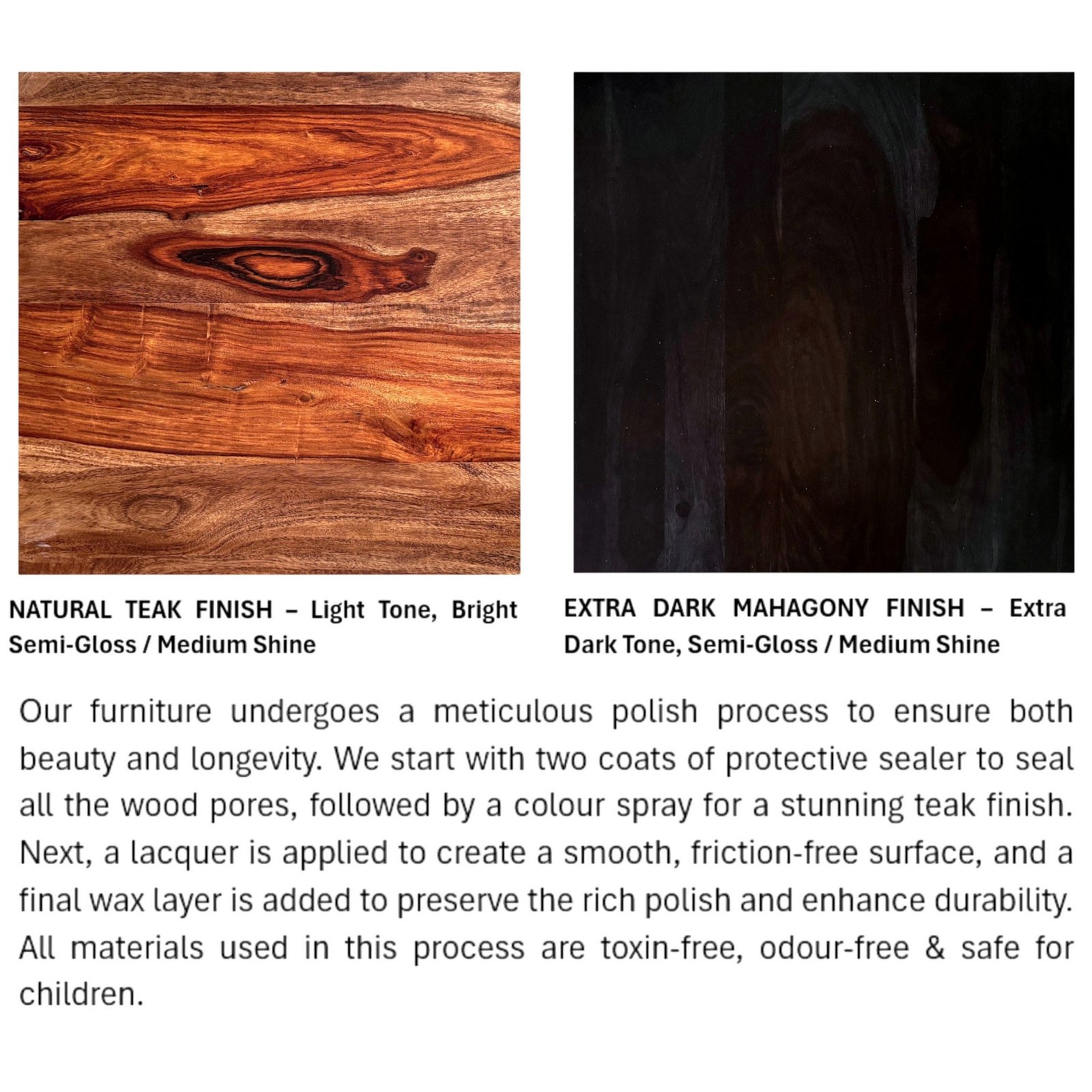 - Crafted from 100% seasoned solid Sheesham wood, this product features a Natural Teak finish that highlights its light, warm tone & Legs have black finish giving it a contrasting dual tone look. The bright semi-gloss provides a medium shine, enhancing its natural beauty. Finished with lacquer polish and a water-resistant protective sealer, it combines elegance with durability, offering timeless appeal and long-lasting protection.