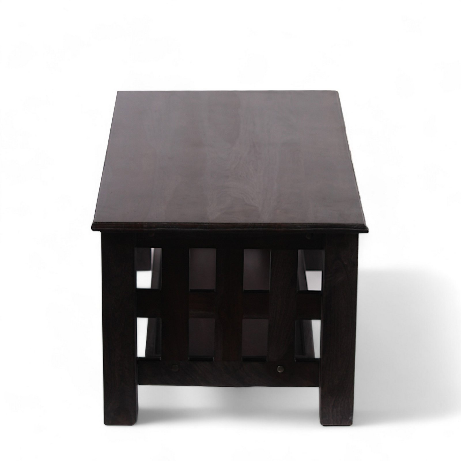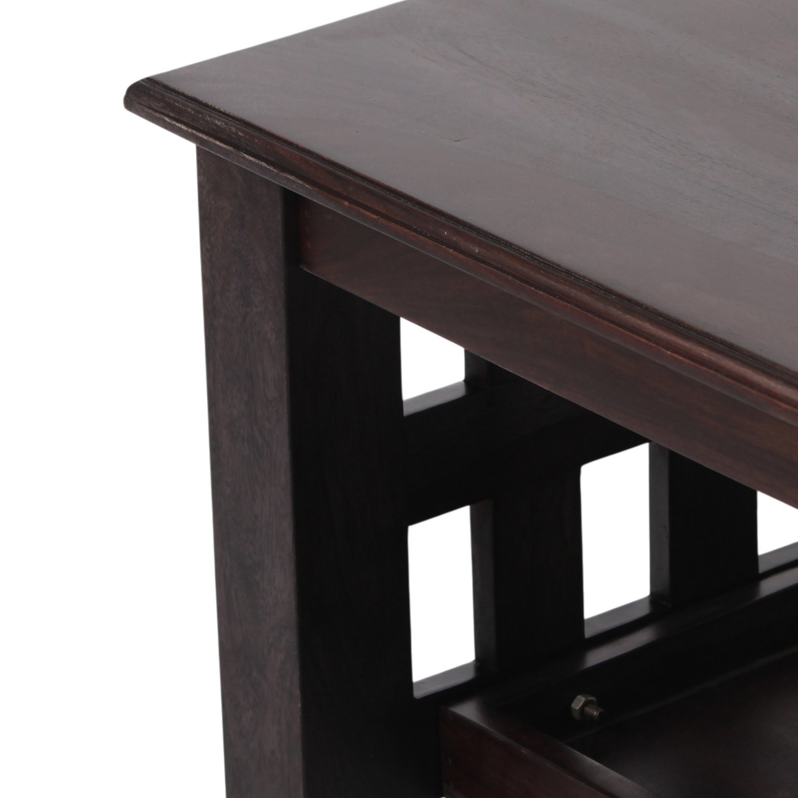 - Made from 100% seasoned solid Sheesham wood, this piece features a striking Dark Mahogany finish that enhances its rich, dark tone. The bright semi-gloss polish provides a medium shine, adding a touch of sophistication to any room. Finished with lacquer polish and a water-resistant protective sealer, it combines timeless beauty with durable protection for long-lasting elegance.