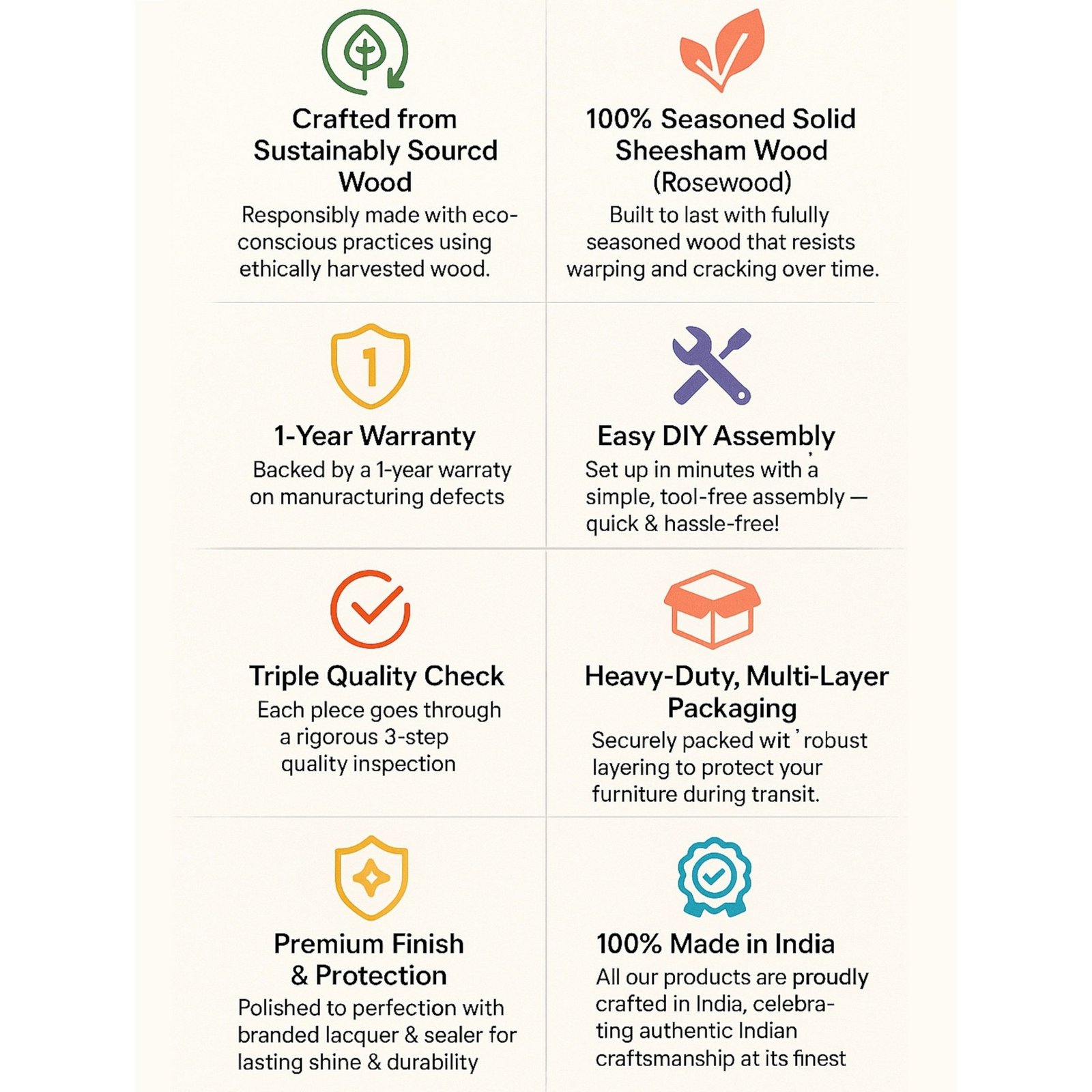The product comes with a 1 Year warranty against any manufacturing defects and any other issues with the materials that have been used. 5 Years warranty in cases of termites and borers The warranty does not cover damages due to usage of the product beyond its intended use and wear & tear in the natural course of product usage. Cuts or scratches, or damage caused by impacts or accidents are also not covered.