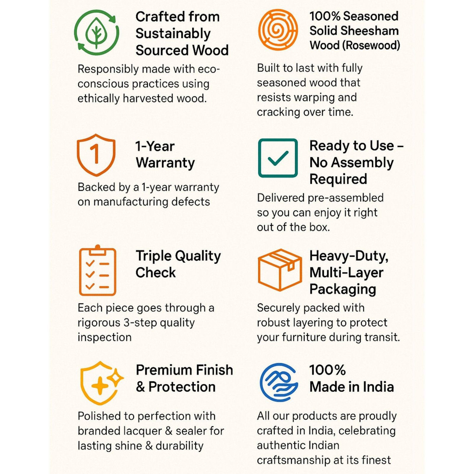The product comes with a 1 Year warranty against any manufacturing defects and any other issues with the materials that have been used. 5 Years warranty in cases of termites and borers The warranty does not cover damages due to usage of the product beyond its intended use and wear & tear in the natural course of product usage. Cuts or scratches, or damage caused by impacts or accidents are also not covered.