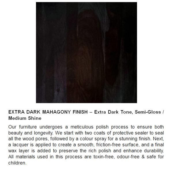 Crafted from 100% seasoned solid Sheesham wood, this piece is beautifully finished in an extra dark mahogany tone, offering a rich, semi-gloss shine. Polished with premium lacquer and safeguarded with a water-resistant protective sealer, it brings a touch of luxury and long-lasting resilience to your home.