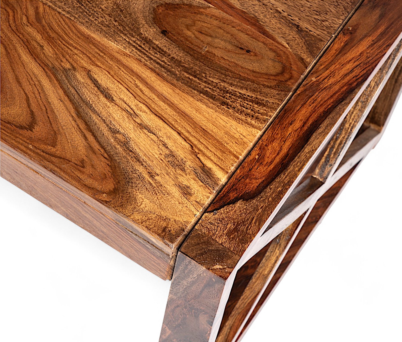 - Crafted from 100% seasoned solid Sheesham wood, this piece features a stunning light-tone teak finish with a bright, semi-gloss shine. Polished with high-quality lacquer and protected by a water-resistant sealer, it combines timeless elegance with exceptional durability, perfect for enhancing any living space.