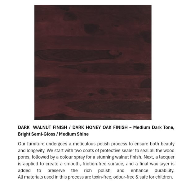 - Crafted from 100% seasoned solid Sheesham wood, this piece features a luxurious dark walnut or dark honey oak finish with a medium-dark tone and a bright semi-gloss sheen. Polished with premium lacquer and protected by a water-resistant sealer, it combines rich elegance with lasting durability, perfect for enhancing any space with timeless beauty.