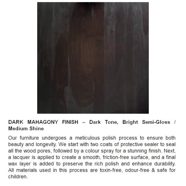 - Made from 100% seasoned solid Sheesham wood, this piece features a striking Dark Mahogany finish that enhances its rich, dark tone. The bright semi-gloss polish provides a medium shine, adding a touch of sophistication to any room. Finished with lacquer polish and a water-resistant protective sealer, it combines timeless beauty with durable protection for long-lasting elegance.