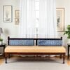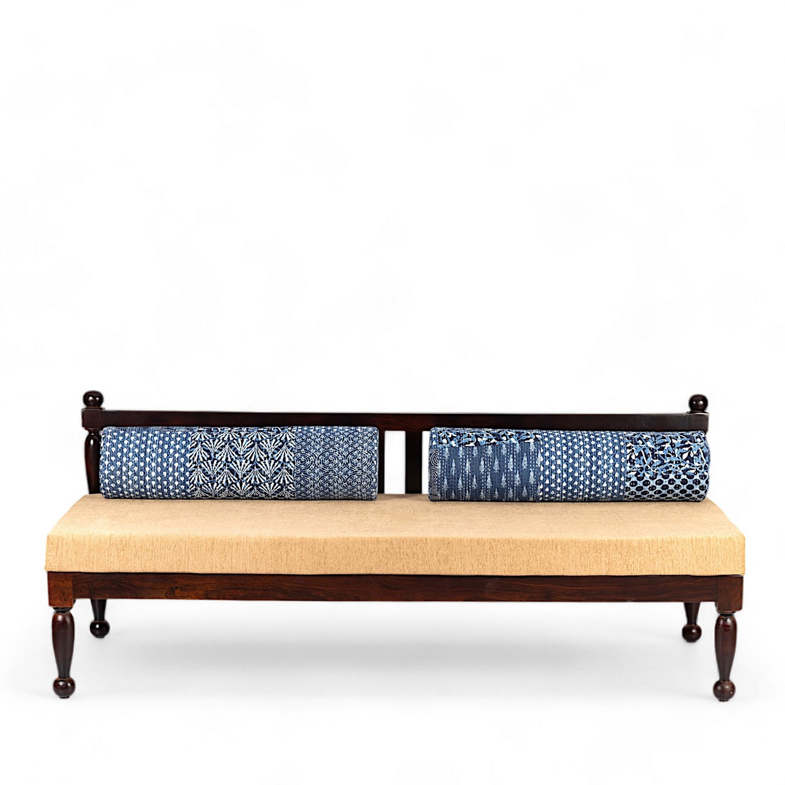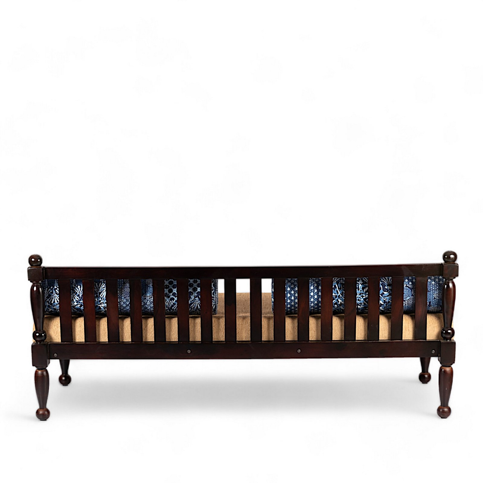 Ikiriya Daylesford Sheesham Wood Mid Century Diwan/ Couch in Dark Walnut Finish with 2 Masands (Cushions) in indigo Printed Kantha Fabric