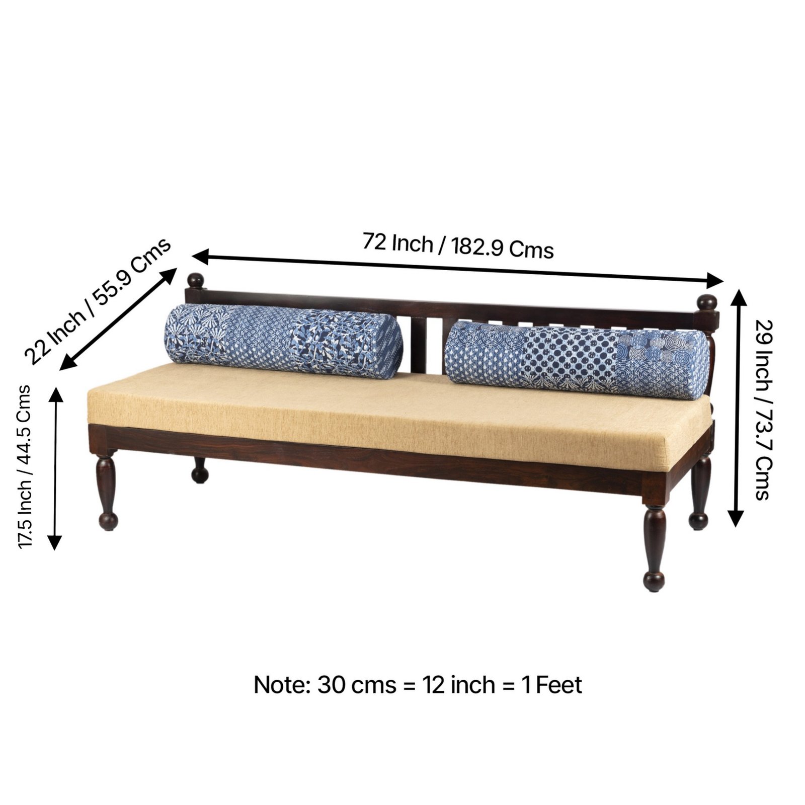 - Dimensions (WxDxH): Diwan – 72x22x29 Inch / 182.9×55.9×73.7 Cms; Seating Height – 17.5 Inch / 44.5 Cms; Weight – 65 Kgs | Masand (Cushion) – 19x8x8 Inch / 48.3×20.3×20.3 Cms