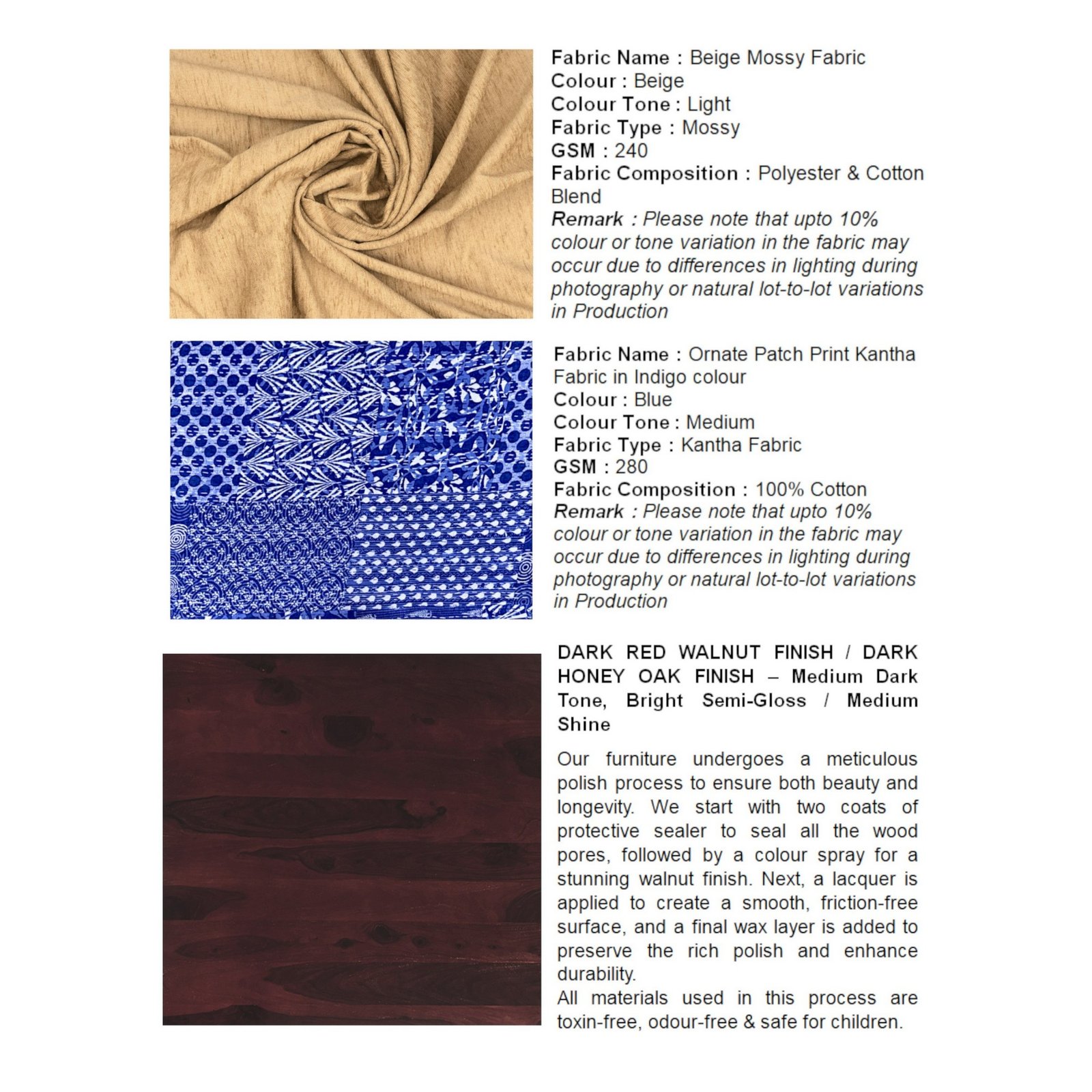 - Embrace comfort with Beige Mossy Fabric Upholstery and two Masands (cushions) in Indigo Printed Kantha Fabric.
