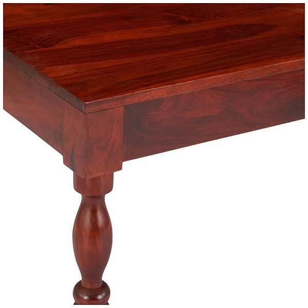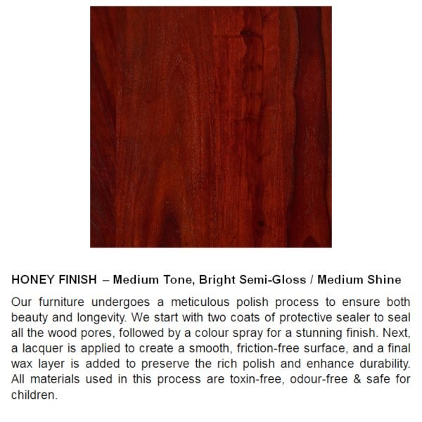 - Crafted from 100% seasoned solid Sheesham wood, this piece features a stunning Honey finish with a warm, medium tone. The bright semi-gloss polish adds a medium shine, enhancing its natural grain and charm. Protected with lacquer polish and a water-resistant sealer, it offers both beauty and long-lasting durability, making it a perfect blend of style and resilience.